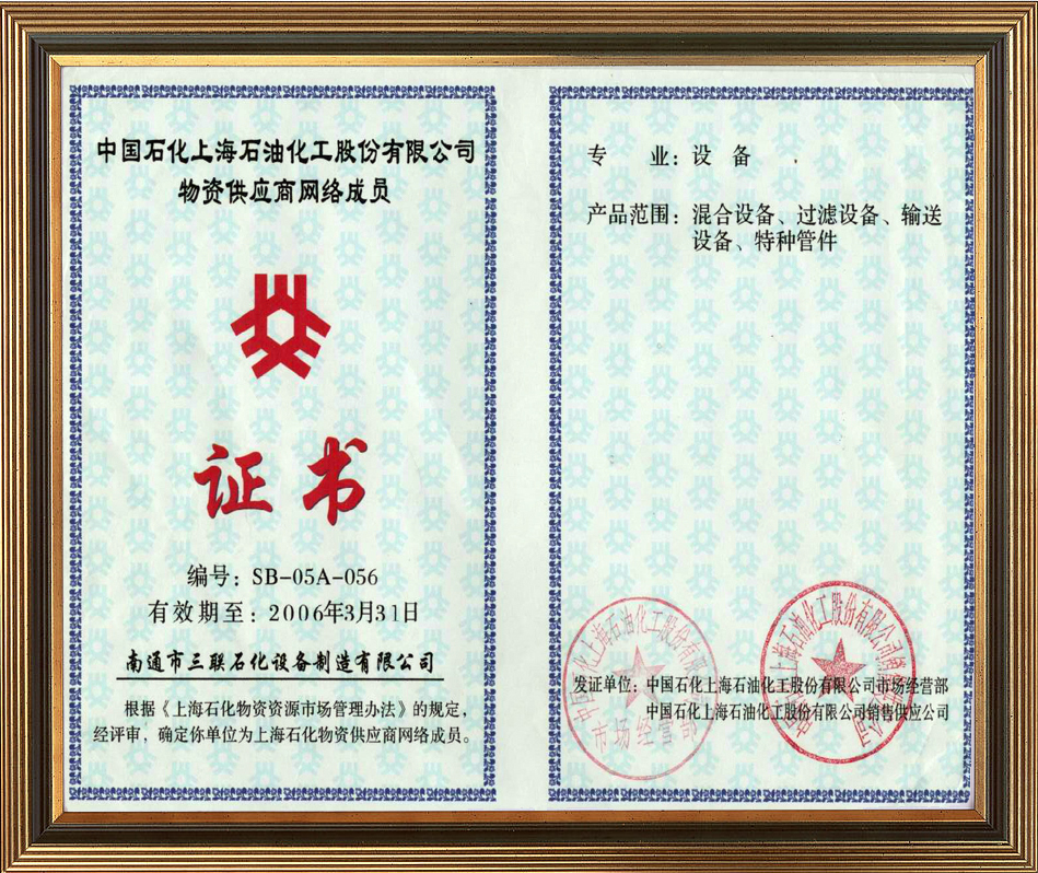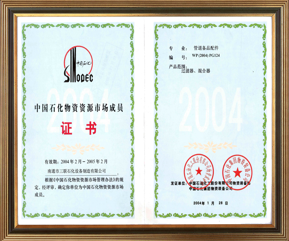 中國石化物資資源市場成員證書