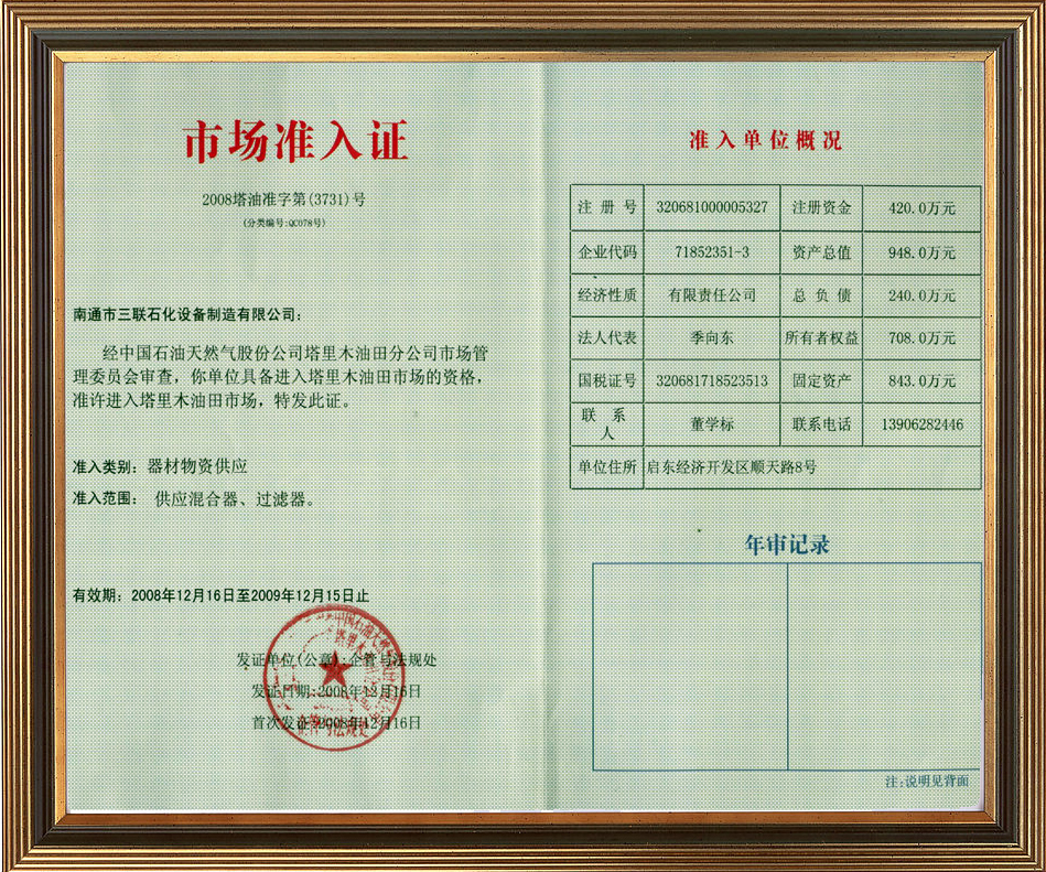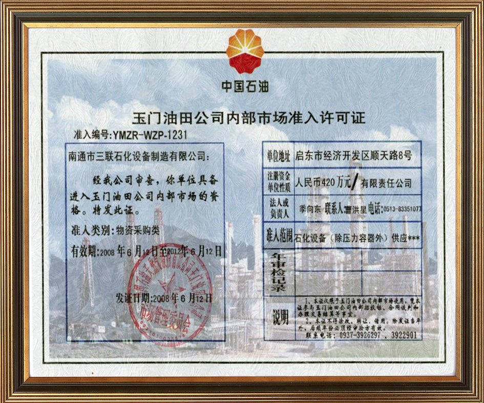 玉門油田公司內部市場準入許可證