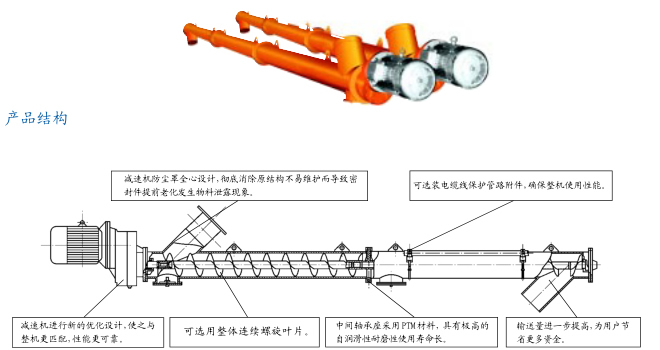 應用領域 適用于化工、冶金、建筑、糧食加工等行業粉粒體的輸送。 例:炭黑、純堿、水泥、化肥、農藥、面粉糧食等。 性能特點 一高效率的輸送:小直徑、高轉速、變螺距的螺旋體設計,確保產品在工作過程中順暢、快速、均勻上料。 一隨意的布置:輸送機的外殼采用優質無縫鋼管通過法蘭名段連接為整體,故整體剛性好,無論是水平,還是大傾角均可連續輸送,并可直接與其配套的設備連接固定,無需地基基礎,充分利用空間,移動、拆裝十分方便。 一良好的潤滑:本公司專有PTM材料少油潤滑滑動瓦加多層迷宮式油封設計以及由油泵,分配器,管路形成的集中潤滑系統,使整機各運動付得到充分潤滑,從而延長了整機的使用壽命。雙重保護,自然更勝一籌。 一可靠的密封:潤滑密封可靠無滲漏,既無浪費物料,又創造了良好的工作環境,經改良的窺視孔裝置無滲水和物料泄漏之憂。歷經風雨侵襲卻連續工作,且少有故障發生。 一多元化的聯接:進、出料口可采用萬向節、布袋、法蘭聯接方式。 一創新的設計:引進技術生產的專用齒輪減速機,先進合理的設計,結合先進制造工藝和完善的質量保證體系,使其具有體積小,承載轉矩大、噪音低、不滲油等顯著優點。 技術參數